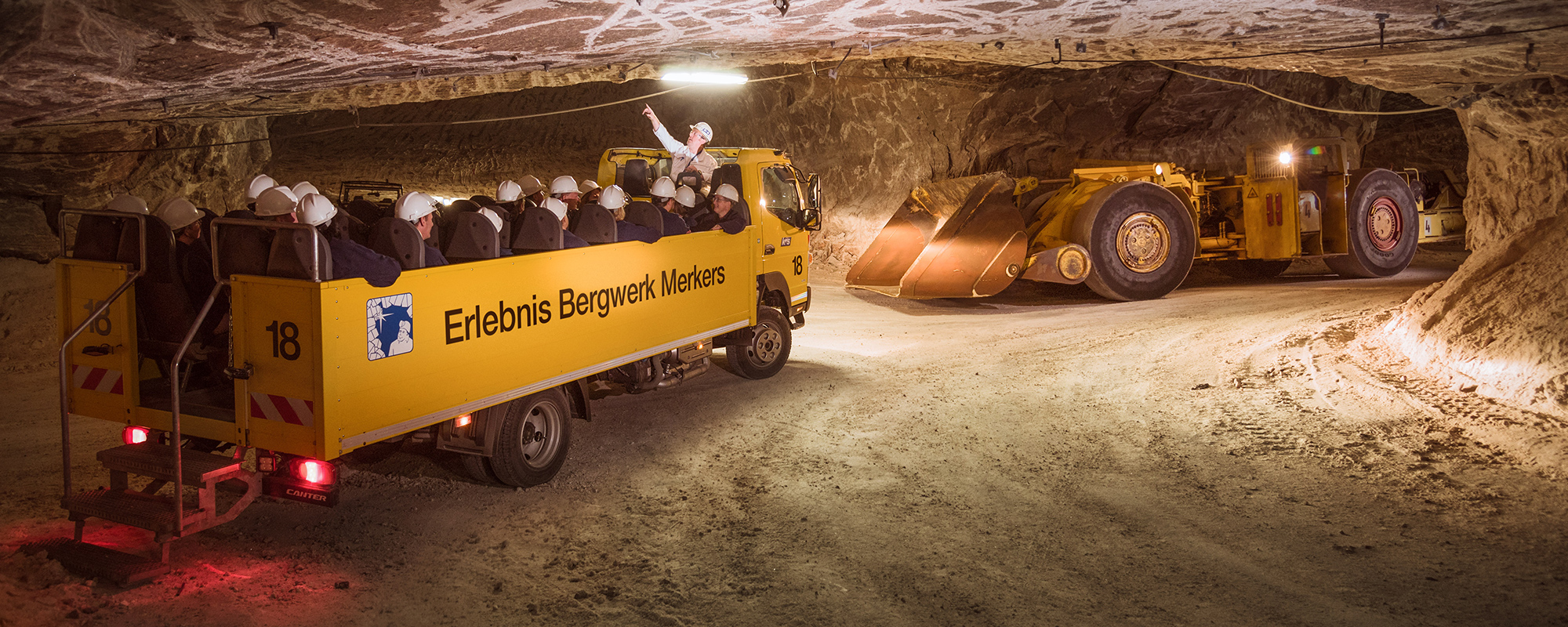Während unserer Erlebnisführung zu verschiedenen Stationen unter Tage erleben Sie Technik zum Anfassen und sehen den Kalibergbau, wie er früher war und heute ist. Das untertägige Museum ist nur einer unserer spektakulären Besichtigungspunkte. Sie wandeln im historischen Goldraum auf den Spuren des legendären Reichsbank-Schatzes, der Merkers einst zum reichsten Bergwerk der Welt machte. Eine Sprengsimulation und ein begleitender Kurzfilm zeigen Ihnen die Gewinnung des weißen Goldes. Im ehemaligen Großbunker, der heute der größte und tiefste Konzertsaal ist, erleben Sie während der Führung eine spektakuläre Lasershow, die Ihnen einen Eindruck von der außergewöhnlichen Akustik und dem faszinierenden Klangerlebnis vermittelt. Sie erleben als Höhepunkt und zugleich tiefsten Punkt Ihrer Reise in die Welt des weißen Goldes die einmalige Kristallgrotte mit riesigen Salzkristallen.
